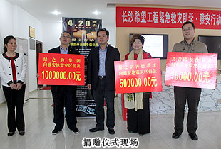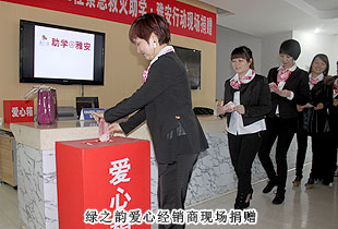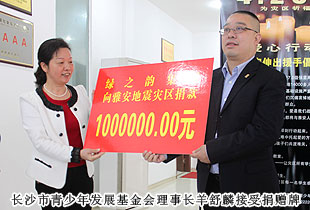4月24日上午,在共青團(tuán)長(zhǎng)沙市委、長(zhǎng)沙市青少年基金會(huì)聯(lián)合舉行的“希望工程緊急救災(zāi)助學(xué)?雅安行動(dòng)”現(xiàn)場(chǎng)捐贈(zèng)儀式上,湖南省政協(xié)委員、長(zhǎng)沙市光彩事業(yè)基金會(huì)理事長(zhǎng)、綠之韻集團(tuán)董事長(zhǎng)胡國(guó)安代表集團(tuán)公司向長(zhǎng)沙市青少年基金會(huì)捐款100萬(wàn)元,救災(zāi)助學(xué),向?yàn)?zāi)區(qū)的孩子們送去綠之韻人的關(guān)愛與溫暖。同時(shí),長(zhǎng)沙市政協(xié)委員、綠之韻國(guó)際集團(tuán)(東南亞)股份有限公司總經(jīng)理張曉琴代表綠之韻善德國(guó)際向長(zhǎng)沙市青少年基金會(huì)捐款50萬(wàn)元人民幣,并在儀式現(xiàn)場(chǎng)組織綠之韻善德經(jīng)銷商代表再次進(jìn)行了募捐活動(dòng)。