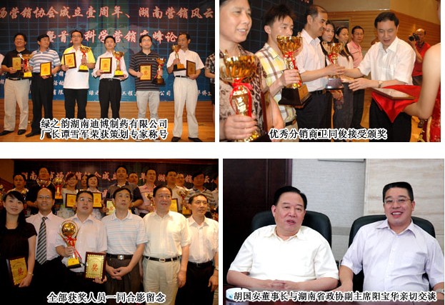 2009年6月23日上午,胡國安董事長應邀出席在湖南省委蓉園賓館隆重舉行的“湖南省市場營銷協(xié)會成立周年慶典暨湖南營銷風云人物頒獎典禮”活動,并榮獲“2008—2009年度湖南省十大營銷風云人物”稱號,此外,綠之韻集團執(zhí)行總經(jīng)理龔振榮獲“湖南十大營銷團隊建設專家”稱號、董事長助理馬艷榮獲“湖南十大營銷管理專家”稱號,綠之韻湖南迪博制藥有限公司廠長譚雪軍榮獲“湖南十大營銷策劃專家”稱號、優(yōu)秀分銷商衛(wèi)同俊榮獲“湖南十大營銷團隊建設專家”稱號,再一次向社會各界展示了綠之韻集團雄厚的管理實力。