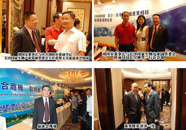 2009年5月18-20日,2009中國・長沙(香港)承接產(chǎn)業(yè)轉(zhuǎn)移投資貿(mào)易懇談會在香港舉行。胡國安董事長應(yīng)長沙市政府邀請,出席此次懇談會。會上,長沙代表團發(fā)布的總投資達(dá)230.4億美元的80個重大項目,引起與會300多位香港各界名流的廣泛關(guān)注。中共長沙市委副書記、市長張劍飛和與會嘉賓代表共同推動了象征加快發(fā)展的“引擎”,喻示著長沙與香港的經(jīng)貿(mào)合作從此進入“快車道”。