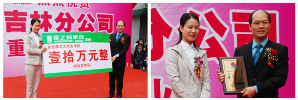 在綠之韻集團(tuán)吉林分公司開業(yè)慶典現(xiàn)場(chǎng),十名手持愛心捐贈(zèng)牌匾的大學(xué)生十分引人注目,他們是由吉林省青少年發(fā)展基金會(huì)甄選出來的品學(xué)兼優(yōu)但家境貧困的大學(xué)生、“綠之韻樹人行動(dòng)”首批資助對(duì)象十名——八名東北師范大學(xué)的貧困大學(xué)生以及兩名綠之韻吉林分銷商子弟。綠之韻慈善基金預(yù)計(jì)總投資一千萬(wàn)開展的“綠之韻樹人行動(dòng)”已正式啟動(dòng),這也意味著綠之韻集團(tuán)一直秉承的“關(guān)愛生命、造福人類” 的理念、助人為樂的精神再一次得到實(shí)現(xiàn)及升華。