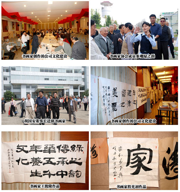 書畫家們在綠之韻集團董事長胡國安的帶領(lǐng)下,首先參觀了綠之韻生物工業(yè)園,胡董事長并向與會者介紹了近年來公司發(fā)展情況及對社會所做的貢獻。之后,書畫家在多功能廳的10米長臺上揮毫潑墨。人物、山水、花鳥魚蟲頓時在這些畫家的筆下顯得栩栩如生,書法家們也不示弱,草書、楷書、隸書、篆體等一揮而就,蒼勁飄逸。