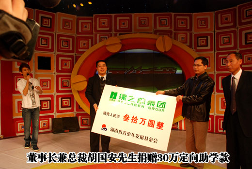 該節(jié)目聯(lián)合愛心企業(yè)籌集善款為貧困山區(qū)捐贈希望小學的欄目宗旨正與綠之韻集團公司愛心助學的理念不謀而合,引起了集團公司領導的關注,并最終促成了此次的合作,這也是該欄目首次推出湖南省外的希望小學捐贈活動。綠之韻集團董事長兼總裁胡國安親臨節(jié)目現(xiàn)場將30萬元現(xiàn)金支票捐贈到湖南省青少年發(fā)展基金會副秘書長李秋林以及孟憲臣校長手中。胡總說:“捐贈38所綠之韻希望學校是所有綠之韻人的追求,三年以來,集團公司投入在慈善公益方面的款項累計已達500多萬,在以后的日子里,我們仍將不斷的為各項社會公益活動奉獻愛心,幫助更多需要幫助的人,在勇往直前的事業(yè)發(fā)展途中,讓愛見證每一位綠之韻人的情懷。