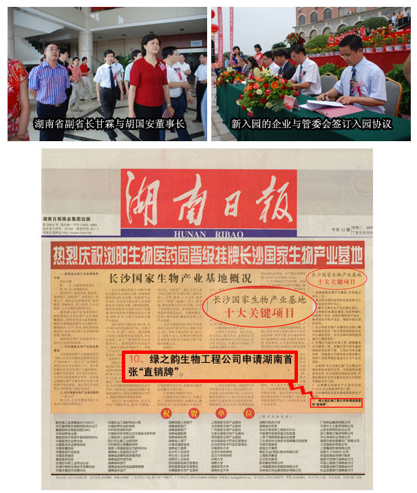 2007年6月12日上午九點(diǎn),綠之韻集團(tuán)國內(nèi)事業(yè)總部所在地瀏陽生物醫(yī)藥園舉行了晉級長沙國家生物產(chǎn)業(yè)基地授牌儀式。國家發(fā)改委副主任張曉強(qiáng)、湖南省人民政府常務(wù)副省長肖捷、湖南省副省長甘霖、長沙市副市長劉曉明等領(lǐng)導(dǎo)出席儀式并講話。綠之韻集團(tuán)董事長兼總裁胡國安先生、董事常務(wù)副總經(jīng)理勞嘉女士作為園區(qū)重點(diǎn)企業(yè)代表也受邀出席了儀式。