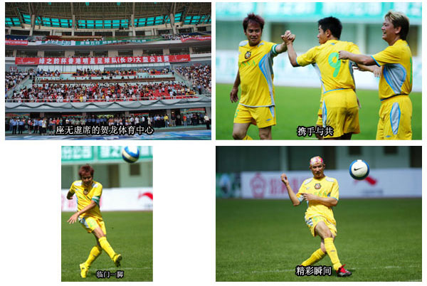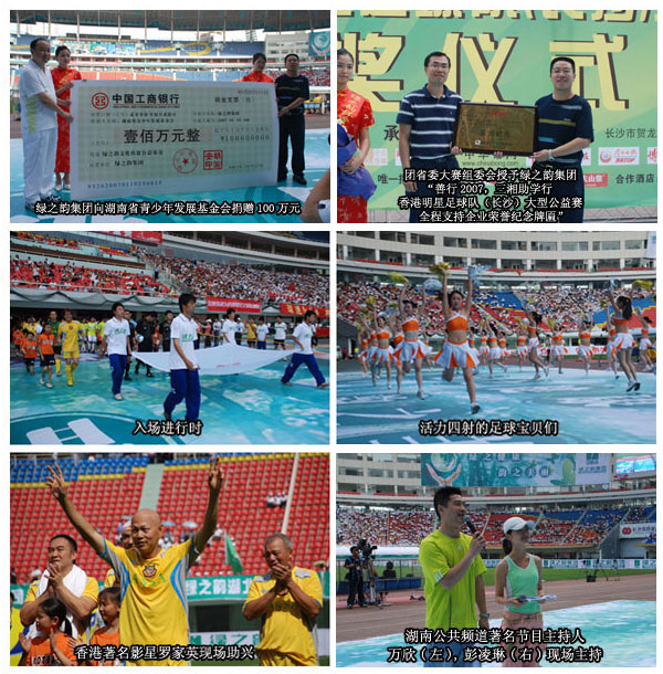 2007年5月20日下午3點(diǎn),星城長(zhǎng)沙因?yàn)檫h(yuǎn)道而來的香港明星足球隊(duì)和來自全國(guó)各地的綠之韻精英顯得更加光輝燦爛。為歡慶四周年慶典,綠之韻集團(tuán)公司與香港明星足球隊(duì)攜手的“綠之韻杯善行2007三湘助學(xué)行”香港明星足球隊(duì)(長(zhǎng)沙)大型公益賽”在賀龍?bào)w育中心隆重進(jìn)行。這是一場(chǎng)由共青團(tuán)湖南省委、湖南省體育局指導(dǎo),湖南省青少年發(fā)展基金會(huì)主辦、綠之韻集團(tuán)全程支持的以助學(xué)為宗旨,以推動(dòng)我省農(nóng)村青年文化扶貧計(jì)劃為主旋律的大型公益活動(dòng)。湖南省人大常委會(huì)副主任王四連女士、共青團(tuán)湖南省委副書記張值恒先生為本次賽事致辭,共青團(tuán)湖南省委副書記陳雪楚、湖南省文化廳廳長(zhǎng)金則恭、湖南省體育局副局長(zhǎng)熊倪、湖南省青少年發(fā)展基金會(huì)理事長(zhǎng)李克勛、中共長(zhǎng)沙市委常委、市政府常務(wù)副市長(zhǎng)向力力、長(zhǎng)沙市人大副主任張菊平 、長(zhǎng)沙市政府副市長(zhǎng)曹亞等政府領(lǐng)導(dǎo)也親臨球賽現(xiàn)場(chǎng)。慈善與體育的水乳交融,明星與精英的交相輝映,讓整個(gè)賽場(chǎng)呈現(xiàn)出令人振奮的萬千姿彩。綠茵場(chǎng)上,這場(chǎng)在善行的大旗下,以愛心的名義舉行的公益足球賽,由湖南省青少年發(fā)展基金會(huì)理事長(zhǎng)李克勛先生和綠之韻集團(tuán)董事長(zhǎng)胡國(guó)安先生共同為比賽開球。香港明星足球隊(duì)與綠之韻善行聯(lián)隊(duì)的對(duì)抗精彩紛呈。譚詠麟、陳百?gòu)?qiáng)、黃日華、羅家英等明星在球場(chǎng)上同樣風(fēng)采照人。活力四射的足球?qū)氊愋?、賽事中?chǎng)香港著名歌星左筠、影星羅家英和炙手可熱的超女唐笑等相繼一展美妙歌喉的精彩表演讓現(xiàn)場(chǎng)觀眾熱情高漲