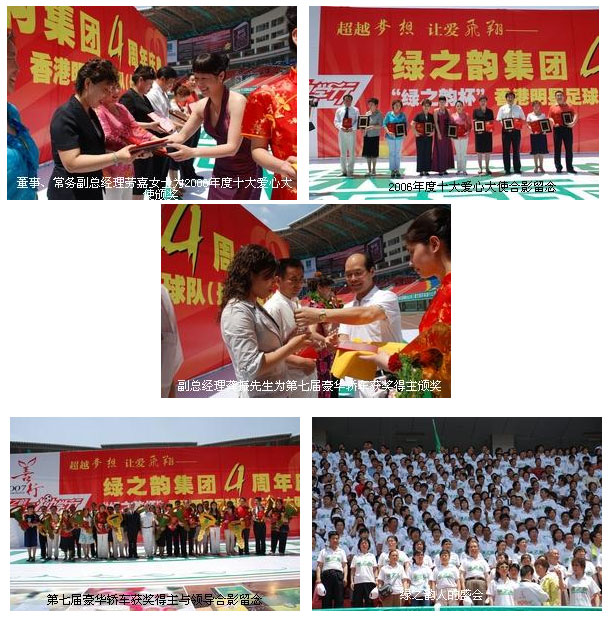 陽光燦爛的五月,一進入賀龍體育中心的慶典現(xiàn)場,身為綠之韻人的自豪感立刻油然而生??扇菁{四萬多人的體育中心處處體現(xiàn)出設計的大氣磅礴,場內(nèi)綠之韻的大型宣傳畫、橫幅、廣告牌、彩旗在館內(nèi)的四面八方迎風招展,歡迎著全體綠之韻家人們的到來。正中心的場地上以“超越夢想,讓愛為翔”為主題的舞臺,宛如一艘即將遠航的巨輪,承載著屬于綠之韻人的愛與夢想。