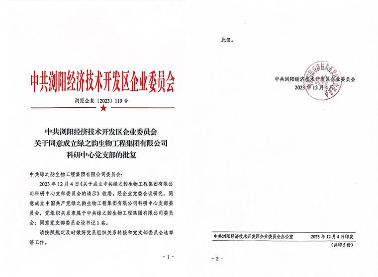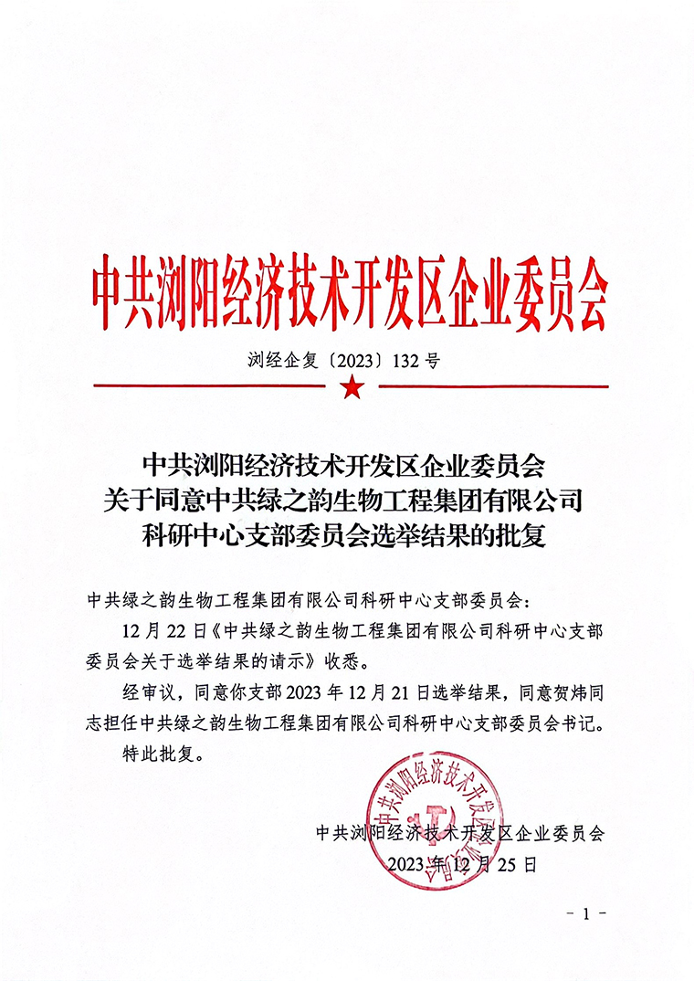 為貫徹落實(shí)黨的二十大精神,進(jìn)一步加強(qiáng)基層黨組織建設(shè),以黨建工作引領(lǐng)科研技術(shù)攻關(guān),充分發(fā)揮黨建工作對(duì)企業(yè)的引領(lǐng)作用,經(jīng)中共瀏陽(yáng)經(jīng)濟(jì)技來(lái)開發(fā)區(qū)企業(yè)委員會(huì)批復(fù)同意,中共綠之韻生物工程集團(tuán)有限公司科研中心黨支部正式成立,賀煒同志當(dāng)選為黨支部委員會(huì)書記。
