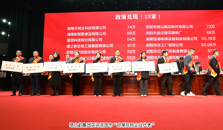 會上,中共瀏陽市委副書記、統(tǒng)戰(zhàn)部部長戴武明宣讀了《關(guān)于對瀏陽市獲得國務(wù)院、國家部委榮譽(yù),受到省人民政府、長沙市人民政府2023年度真抓實(shí)干督查激勵單位予以表揚(yáng)的通報》《關(guān)于表彰瀏陽市“創(chuàng)新實(shí)干 擔(dān)當(dāng)有為”先進(jìn)集體和先進(jìn)個人的決定》和《關(guān)于2023年度縣域經(jīng)濟(jì)高質(zhì)量發(fā)展政策兌現(xiàn)的通知》。大會舉行了企業(yè)政策兌現(xiàn)和優(yōu)秀企業(yè)家、民營經(jīng)濟(jì)高質(zhì)量發(fā)展先進(jìn)個人授牌儀式。表揚(yáng)和表彰獎勵了2023年經(jīng)濟(jì)社會發(fā)展中涌現(xiàn)出的先進(jìn)集體、個人和優(yōu)秀企業(yè)代表。綠之韻生物工程集團(tuán)有限公司獲瀏陽市“政策兌現(xiàn)”表彰、胡國安董事長榮獲瀏陽市“民營經(jīng)濟(jì)高質(zhì)量發(fā)展先進(jìn)個人”、胡均安常務(wù)副總裁榮獲瀏陽市“優(yōu)秀企業(yè)家”。