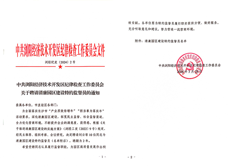 會前,與會人員集中觀看警示教育專題片。瀏陽經(jīng)開區(qū)黨工委委員、紀(jì)工委書記何六生作黨風(fēng)廉政建設(shè)工作報告,瀏陽經(jīng)開區(qū)黨工委副書記羅其勝宣讀《關(guān)于聘請清廉園區(qū)建設(shè)特約監(jiān)督員的通知》。瀏陽經(jīng)開區(qū)黨工委書記鄭以仁為清廉園區(qū)建設(shè)特約監(jiān)督員頒發(fā)聘書。綠之韻集團黨委書記劉云被聘任為瀏陽經(jīng)開區(qū)清廉園區(qū)建設(shè)特約監(jiān)督員。