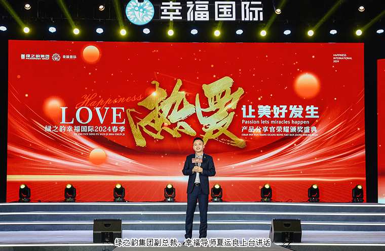 在活動(dòng)接近尾聲之時(shí),綠之韻集團(tuán)副總裁、幸福導(dǎo)師夏運(yùn)良上臺(tái)講話。他向大會(huì)現(xiàn)場(chǎng)以及通過直播互動(dòng)視頻觀看本次大會(huì)盛況的綠之韻幸福國際家人們致以熱烈的歡迎和誠摯的問候,并向每一位獲獎(jiǎng)?wù)弑硎緹崃业淖YR。他表示,今天大會(huì)的主題是熱愛,讓美好發(fā)生。今天站在舞臺(tái)的將近900位產(chǎn)品分享官、每一位戰(zhàn)隊(duì)長和戰(zhàn)隊(duì)代表、所有分享者,以及全新亮相的五大市場(chǎng)的核心管理團(tuán)隊(duì)已經(jīng)很好地詮釋了這個(gè)主題,在2024年第一季度的戰(zhàn)斗中,你們用熱愛創(chuàng)造了一個(gè)美好的奇跡。什么是熱愛?一個(gè)真正熱愛事業(yè)的人,他們會(huì)有強(qiáng)大的內(nèi)在動(dòng)力;會(huì)有超強(qiáng)的抗壓能力;他們有著高效的時(shí)間管理和效率;他們善于創(chuàng)造勇于承擔(dān);他們自身有滿滿的成就感和幸福感。熱愛是綠之韻幸福國際能一直走上坡路的燈塔。從綠之韻幸福國際成立那一天起,科技讓中醫(yī)養(yǎng)生進(jìn)萬家,就是我們奮斗的燈塔。因?yàn)闊釔?,我們傳承和?chuàng)新老祖宗的中醫(yī)智慧,做一款讓世界更美好的產(chǎn)品,幫助更多人收獲健康;因?yàn)闊釔?,我們讓幸福國際成為一個(gè)長久、安全、穩(wěn)健的創(chuàng)業(yè)平臺(tái),讓幸福代言人能夠擁有低門檻就業(yè)、創(chuàng)業(yè)的機(jī)會(huì);因?yàn)闊釔?,我們?huì)努力,成為一群靠譜的人,讓美好在對(duì)的時(shí)間都能如約而至。感謝每一位熱愛著產(chǎn)品、熱愛著綠之韻幸福國際的你們,我會(huì)竭盡全力,為你們的熱愛保駕護(hù)航!