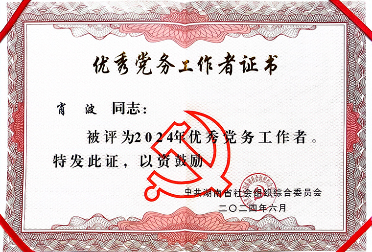 2024年6月27日,湖南省社會組織綜合黨委“七一”表彰暨省級社會組織評估等級授牌會議在長沙召開。會議宣讀了《中共湖南省社會組織綜合委員會關(guān)于表彰先進基層黨組織、優(yōu)秀共產(chǎn)黨和優(yōu)秀黨務(wù)工作者的決定》,對湖南省20個社會組織先進基層黨組織、10名優(yōu)秀共產(chǎn)黨和10名優(yōu)秀黨務(wù)工作者予以表彰獎勵。中共湖南省綠之韻公益基金會黨支部書記肖波獲評“中共湖南省社會組織綜合委員會優(yōu)秀黨務(wù)工作者”。