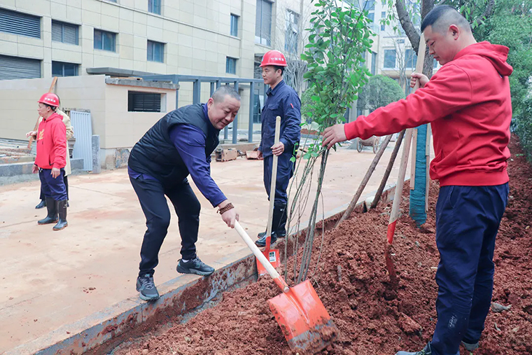 活動(dòng)開始前,眾人在徐繼雷書記的帶領(lǐng)下參觀了綠之韻中心園林項(xiàng)目的生態(tài)建設(shè)成果,深入了解綠之韻中心園林項(xiàng)目規(guī)劃的創(chuàng)新理念。隨后,志愿者們分組領(lǐng)取樹苗及工具,在指定種植區(qū)域揮鍬鏟土、扶苗填坑……在鐵鍬輕吻泥土的簌簌聲中,樹苗被小心地植入坑洞中。旁邊大樹支起的支架宛如綠羅傘骨,為幼小的樹苗撐起一片成長(zhǎng)的天地,仿佛在訴說著對(duì)未來的期許?;顒?dòng)現(xiàn)場(chǎng)一派熱火朝天的景象,紅色的身影與嫩綠樹苗交相輝映,勾勒出一幅“黨建紅”守護(hù)“生態(tài)綠”的生動(dòng)畫面。