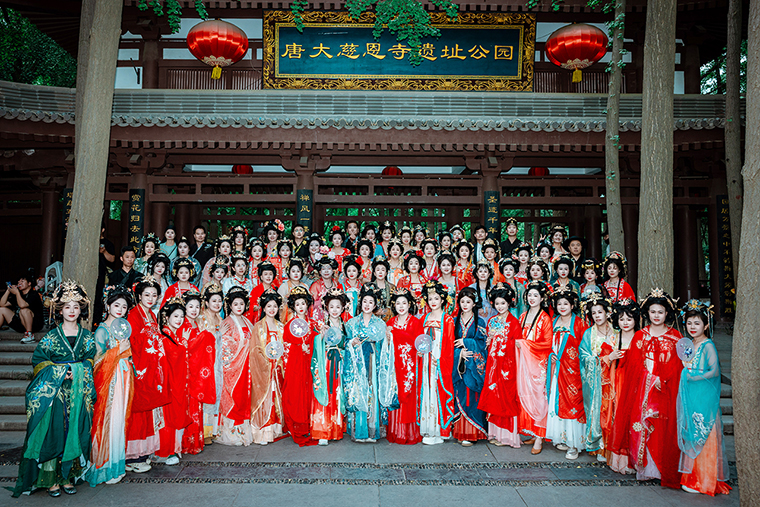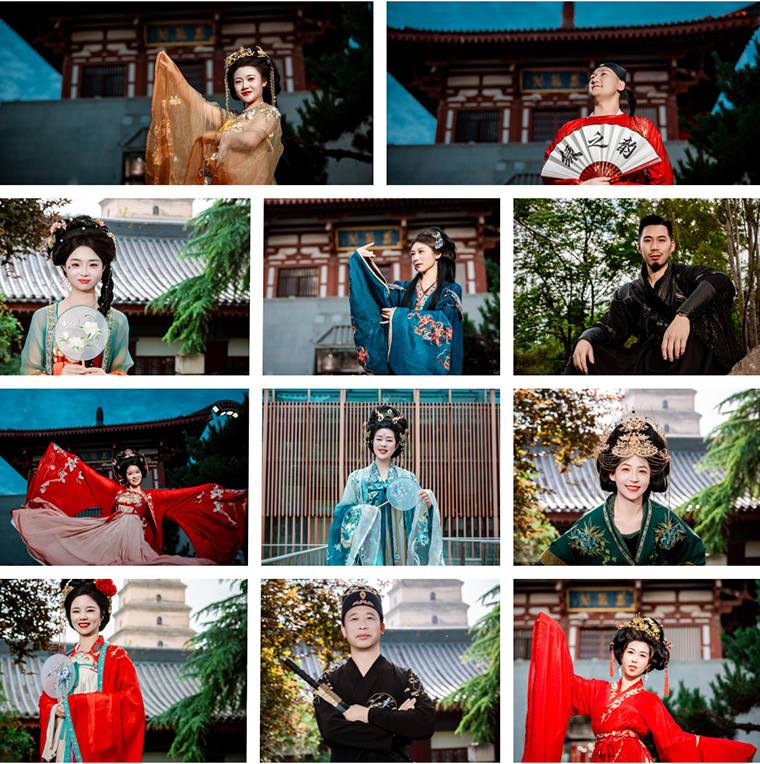 華袍錦裳袂若仙,一夢(mèng)千年越長(zhǎng)安。綠之韻家人們身著曳地襕袍,輕裹織金羅裙,步搖輕顫中更顯仕女端麗,信步踏入「長(zhǎng)安十二時(shí)辰」街區(qū) —— 雕梁畫棟間浮動(dòng)著唐宮香篆,胡商貨攤與彩樓旗幡交相輝映,恍若化身為貞觀年間的貴胄子弟,在酒肆茶坊間拾掇千年光陰。轉(zhuǎn)過(guò)坊墻,大慈恩寺遺址公園的禪意撲面而來(lái)。雁塔影落碧池,銀杏葉染秋光,家人們于古槐下合十靜立,攝影師鏡頭里收盡襦裙廣袖的典雅氣韻,歷史厚重感與文化自信在快門聲中凝成永恒注腳。暮色浸透時(shí),大唐不夜城的鎏光燈河轟然點(diǎn)亮。家人們羅衣飄帶拂過(guò)現(xiàn)代潮玩店的櫥窗,在古今交融的街巷里織就流動(dòng)的盛唐長(zhǎng)卷。每一張定格的照片里,都封存著穿越千年的風(fēng)雅與此刻的歡暢。