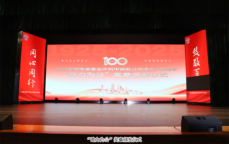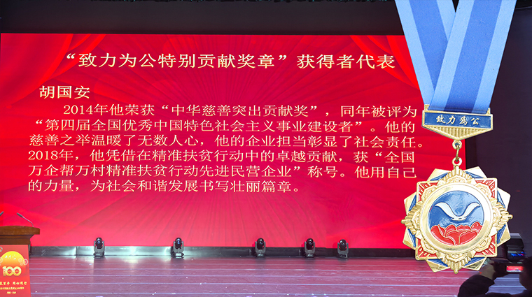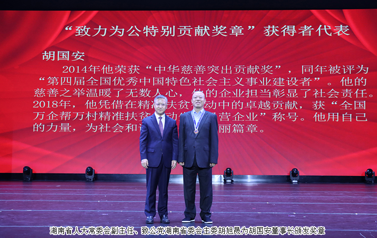 演出前舉行了隆重的“致力為公”獎(jiǎng)?wù)骂C獎(jiǎng)儀式。在熱烈的掌聲中,胡國安董事長上臺(tái)接受“致力為公”特別貢獻(xiàn)獎(jiǎng)?wù)隆nC獎(jiǎng)辭寫到:“2014年他榮獲‘中華慈善突出貢獻(xiàn)獎(jiǎng)’,同年被評(píng)為‘第四屆全國優(yōu)秀中國特色社會(huì)主義事業(yè)建設(shè)者’。他的慈善之舉溫暖了無數(shù)人心,他的企業(yè)擔(dān)當(dāng)彰顯了社會(huì)責(zé)任。2018年,他憑借在精準(zhǔn)扶貧行動(dòng)中的卓越貢獻(xiàn),獲‘全國萬企幫萬村精準(zhǔn)扶貧行動(dòng)先進(jìn)民營企業(yè)’稱號(hào)。他用自己的力量,為社會(huì)和諧發(fā)展書寫壯麗篇章?!贝隧?xiàng)榮譽(yù)正是對(duì)他多年來在參政議政、社會(huì)服務(wù)、僑海聯(lián)絡(luò),特別是在公益慈善與鄉(xiāng)村振興等領(lǐng)域持續(xù)貢獻(xiàn)的高度認(rèn)可,充分體現(xiàn)了致公黨湖南省委會(huì)對(duì)優(yōu)秀黨員堅(jiān)守“致力為公、僑海報(bào)國”初心的肯定與褒揚(yáng)。