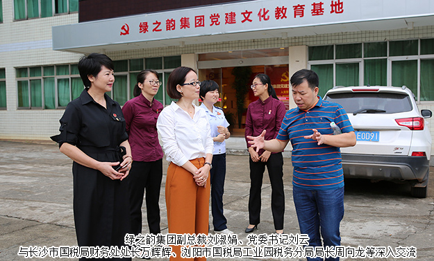 為進一步推動“兩學一做”學習教育常態(tài)化、制度化,2017年9月28日,長沙市國稅局財務處處長萬輝輝、副處長張翼翔,瀏陽市國稅局工業(yè)園稅務分局局長周向龍、副局長陳朝陽、李柯平、李學東等一行蒞臨綠之韻集團參觀,與綠之韻集團黨委第五支部開展主題黨日交流活動。綠之韻集團副總裁劉淑娟、黨委書記劉云,集團第五支部書記程芳等陪同參觀。