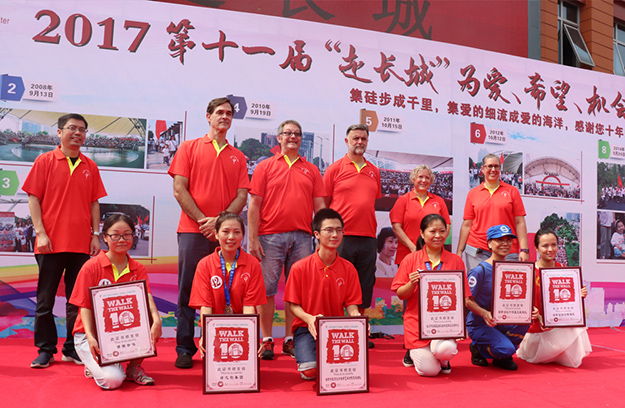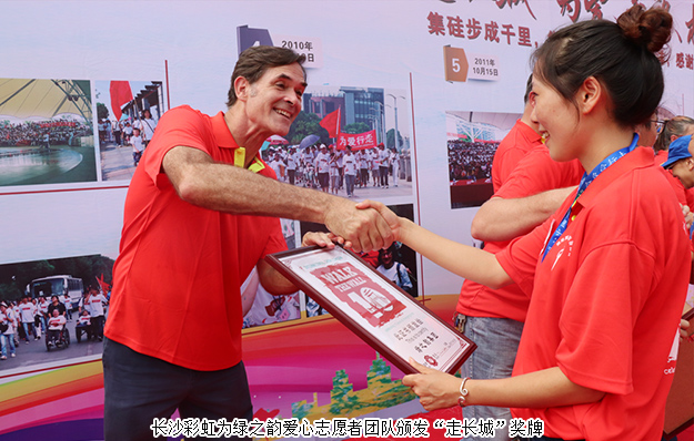 用腳步丈量愛心,用公益詮釋生命?;顒咏Y束后,愛心志愿者和其他愛心團隊成員、義工們彼此分享了行走過程中感人的故事和感悟。來自長沙彩虹的國際義工和晨光中心的孩子們?yōu)橹驹刚邆儙砹司臏蕚涞母卸鞔鹬x節(jié)目。閉幕式上,綠之韻集團董事總裁、綠之韻公益基金會理事長勞嘉為本次活動致辭:今年,是長沙彩虹“走長城”活動的第十一個年頭,綠之韻愛心志愿者已連續(xù)多年參加了此項公益活動。我們攜手與孩子們一起行走,以實際行動號召各界愛心人士、企業(yè)參與到公益慈善的行列,為孤殘兒童獻愛心。奉獻一份愛心,就能點燃一片希望。今后,綠之韻將一如既往地支持各項公益慈善事業(yè),用實際行動去詮釋愛,傳遞愛,分享愛。活動最后,國際義工們還為愛心團隊、綠之韻愛心志愿者團隊頒發(fā)了“走長城”證書。