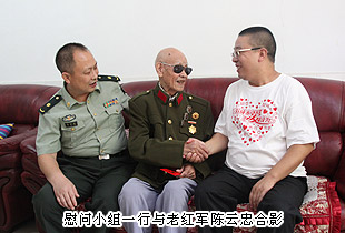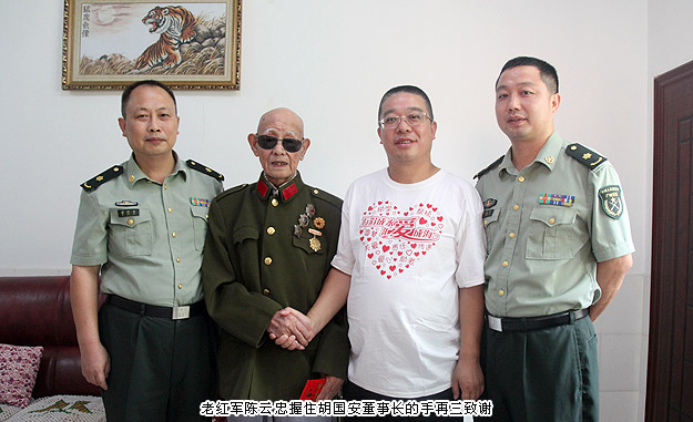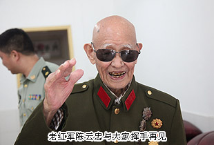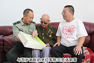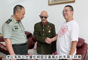 已逾百歲高齡的老紅軍陳云忠家中十分整潔,一面墻上醒目的掛著青年毛主席的肖像。談起革命往事,陳老記憶的閘門被打開(kāi),談起革命往事如數(shù)家珍。這位“飛奪瀘定橋”的幕后英雄,有一次夜行軍就磨破了一雙新鞋,他說(shuō)勝利就是一步步爭(zhēng)取得來(lái)的。可別看陳老身體好,他也受過(guò)傷痛的折磨,“大傷小傷都受過(guò),有一塊彈片在身體里呆了10多年。”1939年,陳老參加著名的黃土嶺戰(zhàn)役時(shí),敵人的一個(gè)小鋼炮打過(guò)來(lái),一塊彈片穿進(jìn)了他的右肩。由于醫(yī)療條件有限,陳老的肩膀當(dāng)時(shí)只進(jìn)行了一些簡(jiǎn)單的消炎處理,這塊彈片直到1951年才取出。當(dāng)大家詢問(wèn)起老人的身體時(shí),老人舉起手來(lái)十分自豪說(shuō):“我還能自己做飯呢。”而看到胡國(guó)安董事長(zhǎng)送上的慰問(wèn)品和慰問(wèn)金后,老人頗有些羞澀,感觸的說(shuō):“謝謝你們對(duì)我的關(guān)心,我一切都好!”