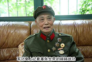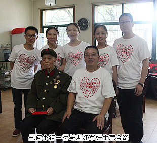 爾后,慰問(wèn)小隊(duì)一行又來(lái)到了老紅軍張生榮家中。“十月里來(lái)秋風(fēng)涼,中央紅軍遠(yuǎn)征忙;星夜渡過(guò)于都河,古陂新田打勝仗”。這首長(zhǎng)征組詩(shī),是紅軍夜渡于都河踏上漫漫長(zhǎng)征路的真實(shí)寫(xiě)照。而老紅軍張生榮再念起這首詩(shī)時(shí),卻有著無(wú)盡的懷念。說(shuō)起當(dāng)年的戰(zhàn)斗,老紅軍張生榮,尤其興奮,長(zhǎng)征中紅軍搶渡大渡河、17勇士飛奪瀘定橋的戰(zhàn)斗中,作為司號(hào)員的張生榮,昂首挺胸吹響了沖鋒號(hào)……張老眉胡皆白,耳朵已經(jīng)聽(tīng)不大清楚,但精神抖擻,坐姿筆體,寬大手掌力氣不小。張老說(shuō),這都是練出來(lái)的,即使現(xiàn)在還會(huì)不時(shí)炸些花生米,自我慰勞。只有經(jīng)歷了戰(zhàn)爭(zhēng)的洗禮,才會(huì)更加珍惜今天的和平與幸福。才離休那會(huì),張老還經(jīng)常發(fā)揮余熱,到工廠、學(xué)校、機(jī)關(guān)作報(bào)告,講長(zhǎng)征精神,講革命傳統(tǒng),講白求恩大夫的事跡。