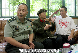 長(zhǎng)征不怕遠(yuǎn)征難,萬(wàn)水千山只等閑。念起這首膾炙人口的《長(zhǎng)征》胡國(guó)安董事長(zhǎng)來(lái)到居住于湖南省軍區(qū)干休所內(nèi)的兩位著名老紅軍的家中。在這郁郁蔥蔥、鳥(niǎo)語(yǔ)花香的住所里,居住著一批為黨、為人民解放事業(yè)鞠躬盡瘁的離休老干部。而今天,我們看望的這兩位老紅軍,自1963年全軍修建起第一批紅軍干休所東湖干休所后,就居住在這里。上世紀(jì)50年代,他們榮獲了八一勛章、獨(dú)立自由勛章和解放勛章。他們?cè)鴧⒓佣f(wàn)五千里長(zhǎng)征,他們?cè)I(lǐng)中國(guó)革命走向勝利,他們?cè)H歷新中國(guó)的滄桑巨變,更成為中華振興的見(jiàn)證者。如今,白發(fā)蒼蒼的老紅軍們已是年近百歲高齡,今天,在此地我們有幸聽(tīng)老革命講那過(guò)去的故事。他們的名字是張生榮、陳云忠!