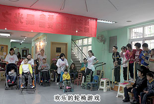 接著,志愿者們還和學(xué)生一起進行了輪椅游戲,將志愿者和孩子們分成四組,設(shè)定兩個跑道,在一句“預(yù)備,起!”的喊聲中,游戲開始,激烈的角逐,讓孩子們紛紛大呼加油,鼓舞的歡聲,引發(fā)了全場的共鳴。