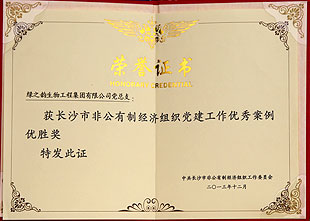 2013年12月25日,毛澤東同志誕辰120周年紀(jì)念日前一天,綠之韻集團(tuán)黨總支部光榮地被中共長沙市非公有制經(jīng)濟(jì)組織工作委員會(huì)授予“長沙市非公有制經(jīng)濟(jì)組織黨建工作優(yōu)秀案例優(yōu)勝單位”稱號,其先進(jìn)事跡和黨建工作經(jīng)驗(yàn)成功入選《長沙市非公有制經(jīng)濟(jì)組織黨建工作優(yōu)秀案例匯編《領(lǐng)航》一書,在全市范圍內(nèi)進(jìn)行宣傳推廣。